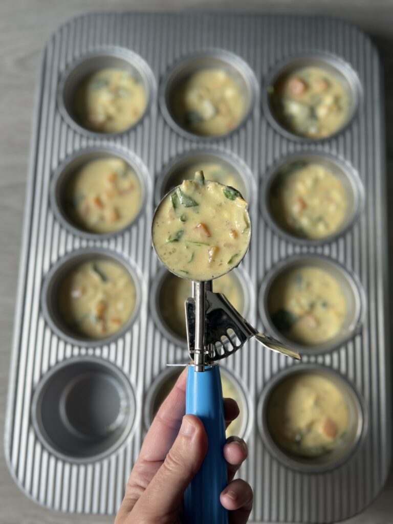 • Pour about ⅓ to ½ cup of the mixture into each muffin cup. I like to use a ⅓ cup portion scoop for easy filling, then evenly distribute any remaining batter among the cups.