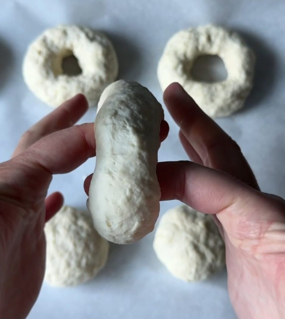 • To shape your bagels use your thumb to indent the dough ball in the middle. Start to make a hole by pushing your finger through. Work the hole by rounding it out with your fingers.
